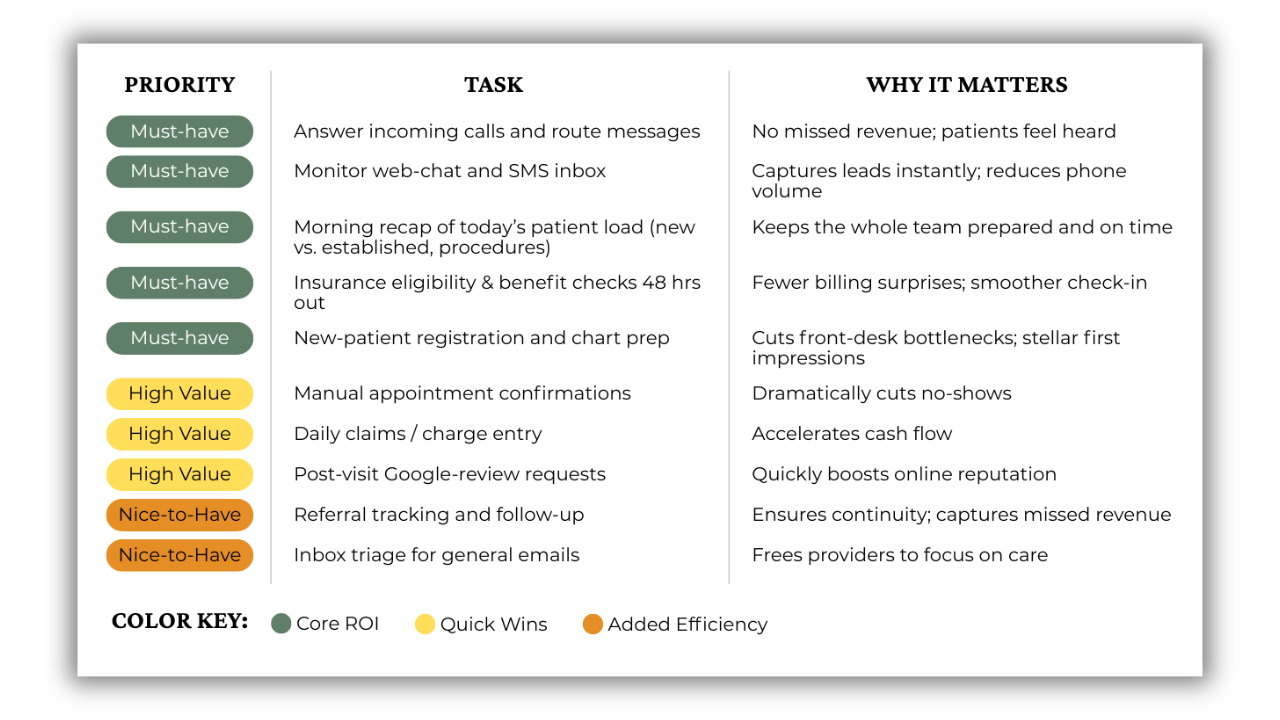 Mapping your daily work onto these lists forces smart delegation—exactly what our Arizona practice did when they moved calls, verifications, and review requests to VAs.